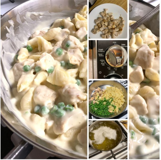 On Tuesday, I made Chicken alfredo in shells with peas. The chicken was Tyson frozen chunks. It looked kinda funky, almost like soup chicken (you know, like Campbell’s weird chicken in chicken noodle soup?) but it tasted fine in this. I liked the texture of the shells and the taste of the Trader Joe’s sauce.
