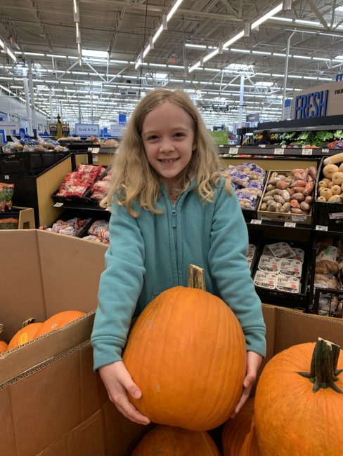 Isabella said something so pure after we picked one out. She looked upward, and said, “Thanks, God, for blessing Walmart with putting the pumpkins on sale.” Her gratitude made me really happy.