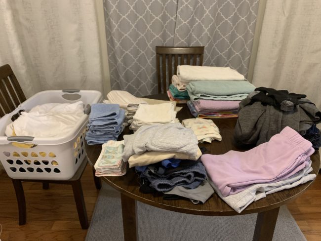 After making dinner (quesadillas, which the girls helped make and then actually ate!!), it was time to do laundry. I had three full baskets to deal with, but it didn’t take too long, thankfully. The above picture is just a smidgen of what I folded and put away, lol.