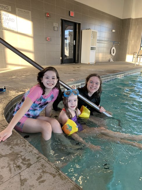 - She learned to swim a few years ago and she loves it. When we travel, we always stay at hotels with indoor pools, so she and her siblings get to swim regardless of the season or weather. We’ve also gone to a local recreation center that has a pool but it’s not as enjoyable for her because she has more anxiety about the possibility of kids showing up. She likes wearing a mask or holding her nose. She isn’t scared of the water at all.